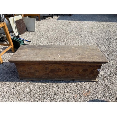 Affascinante cassapanca d'epoca in legno massello, caratterizzata da una linea semplice e autentica. Il mobile presenta ancora tracce di decorazioni pittoriche originali sul fronte.